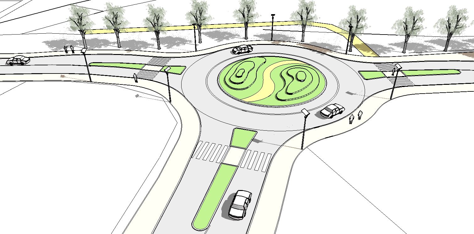 Der Verkehrsfluss in diesem Knotenpunkt wird durch den Kreisverkehrsplatz maßgebend optimiert.